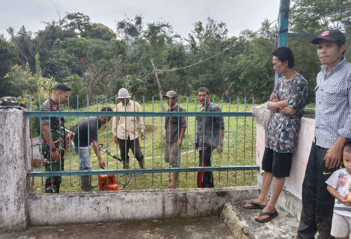 Sipirok - Babinsa Koramil 03/Sipirok Kodim 0212/Tapsel Serda Ahmad Khozali Siregar bersama dengan Warga Desa Padang Bujur melaksanakan gotong-royong pembersihan lingkungan dengan sasaran pemotongan rumput liar di Desa Padang Bujur Kecamatan Sipirok Kabupaten Tapanuli Selatan, Selasa (14/01/2025)
