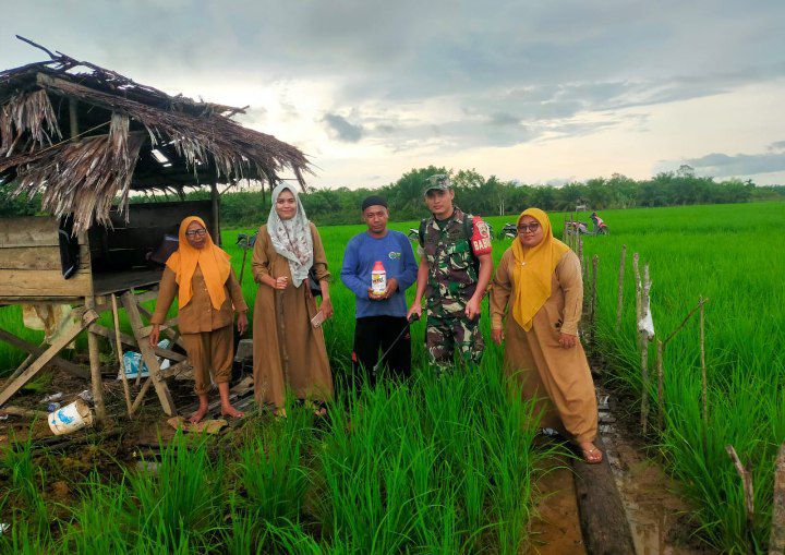 Natal - Babinsa Koramil 17/Natal Kodim 0212/Tapsel Praka Anafoli Laoli bersama PPL melaksanakan kegiatan pendampingan kepada petani melakukan penyemprotan hama tanaman padi sawah di Desa Bonda Kase Kecamatan Natal Kabupaten Mandailing Natal, Senin (27/01/2025)