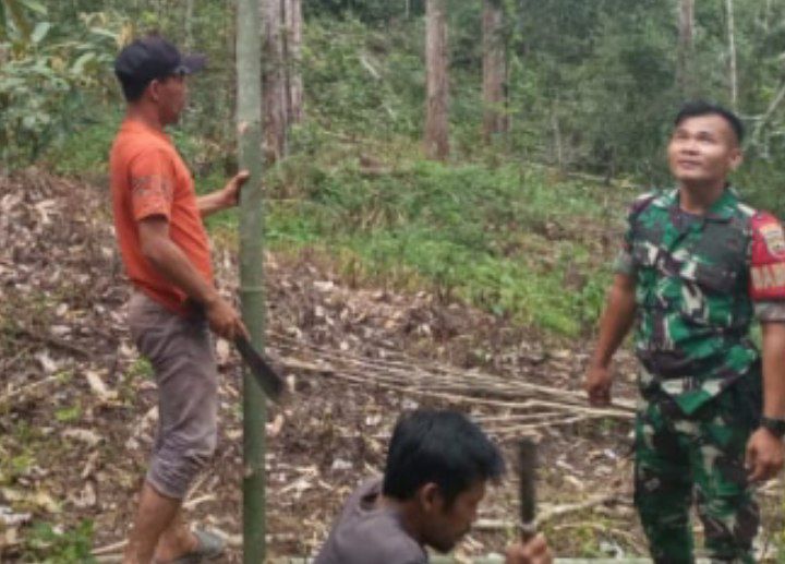Kotanopan – Babinsa Koramil 14/Kotanopan Kodim 0212/Tapsel Pratu Roma Irama Zega membantu warga membangun Gubuk di Kebun durian milik salah satu warga Desa Simandolan Kecamatan Kotanopan Kabupaten Mandailing Natal, Selasa (28/01/2025)