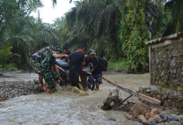 Letda Inf Karya Ganda Rambe, bersama beberapa anggota Satgas TMMD Kodim 0212/Tapsel, bersiap menuju lokasi sasaran kegiatan TMMD di Desa Pintu Padang. Mereka harus menyeberangi sungai untuk mencapai sasaran, tempat di mana berbagai program pembangunan dan bakti sosial dilaksanakan.