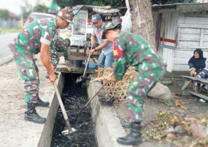Warga bersama Babinsa tampak kompak bahu membahu membersihkan saluran air yang penuh ditutupi tanah lumpur dan sampah yang mengganggu aliran air tidak lancar