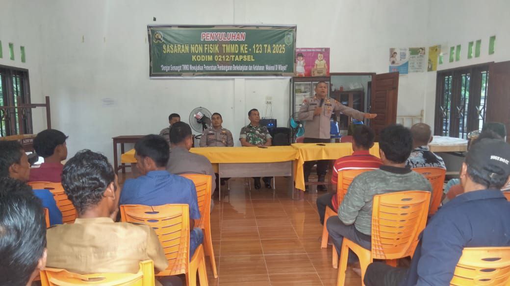 Dansatgas TMMD ke 123 Kodim 0212/Tapsel Letkol Arm Delli Yudha Adi Nurcahyo, S.E.,M.M melalui Tim Media center menyampaikan progam TMMD yang kita laksanakan selain mewujudkan pembangunan infrastruktur/sasaran fisik, kami juga melaksanakan sasaran non fisik salah satunya penyuluhan Hukum dan Kamtibmas kepada masyarakat