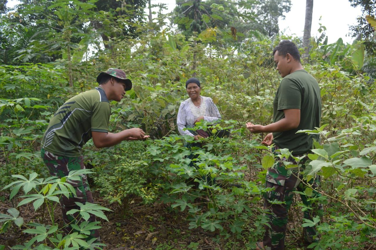 personel Satgas TMMD ke-123 Kodim 0212/Tapsel yang dipimpin oleh Kopda Gisler Samosir membantu warga setempat dalam kegiatan memetik daun singkong dan panen cabai.