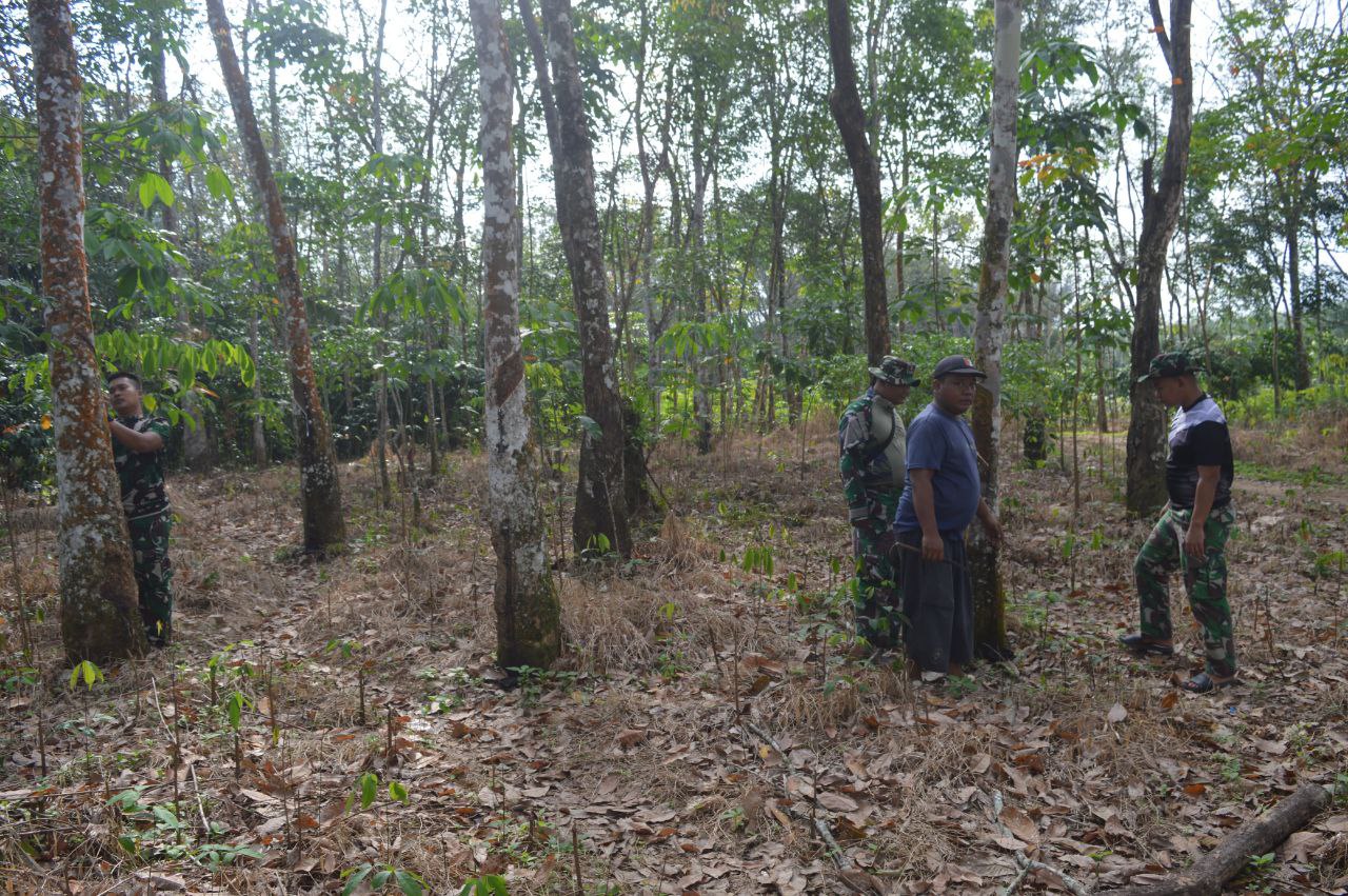 Anggota Satgas TMMD Ke-123 Kodim 0212/Tapsel Pratu Sawal yang menyempatkan untuk mengunjungi salah satu kebun getah karet milik bapak Parlin Rambe yang berada percis dekat pembukaan jalan yang di kerjakan satgas TMMD Ke-123 Kodim Tapsel