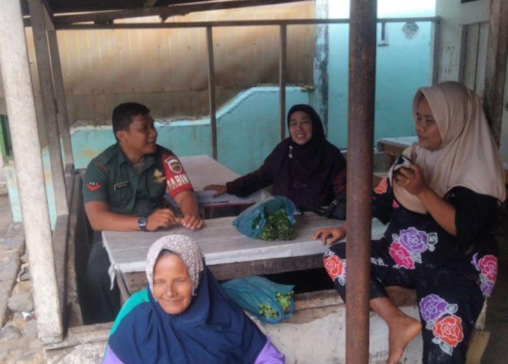 Dalam kesempatan ini, Babinsa berinteraksi dengan ibu-ibu yang sedang duduk-duduk di salah satu rumah warga. Selain bersilaturahmi, ia juga mendengarkan berbagai aspirasi serta memberikan pesan-pesan terkait keamanan dan ketertiban di lingkungan sekitar