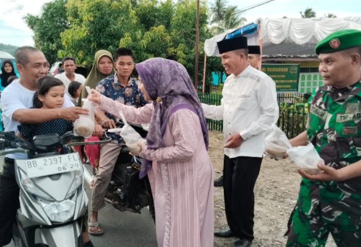 Batang Angkola - Koramil 11/Batang Angkola Kodim 0212/Tapsel melaksanakan kegiatan berbagi takjil Ramadhan kepada masyarakat dan pengguna jalan yang melintasi jalan depan Makoramil 11/Batang Angkola Kelurahan Pintu Padang Kecamatan Batang Angkola Kabupaten Tapanuli Selatan, Rabu (26/03/2025)