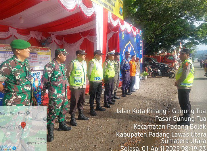 Padang Bolak - Babinsa Koramil 05/PB Kodim 0212/Tapsel Serda Muharram dan Serda Syuryadi DP bersama aparat gabungan melaksanakan siaga pengamanan lebaran tahun 2025 di Pos Pengamanan Lingkungan I Hajoran Kelurahan Pasar Gunung Tua Kecamatan Padang Bolak Kabupaten Padang Lawas Utara, Selasa (01/04/2025)