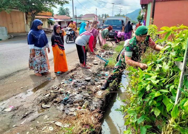 Batang Angkola – Babinsa Koramil 11/BA Kodim 0212/Tapsel Serda AK. Daulay melaksanakan gotong royong membersihkan aliran air atau parit bersama dengan warga di Kelurahan Pintu Padang Kecamatan Batang Angkola Kabupaten Tapanuli Selatan, Selasa (22/04/2025)