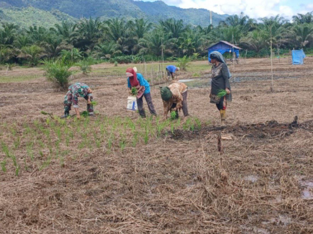 Dalam pelaksanaannya, Babinsa langsung menyambangi para petani yang sedang beraktivitas di sawah sekaligus sebagai upaya untuk memberikan semangat dalam mempercepat masa tanam