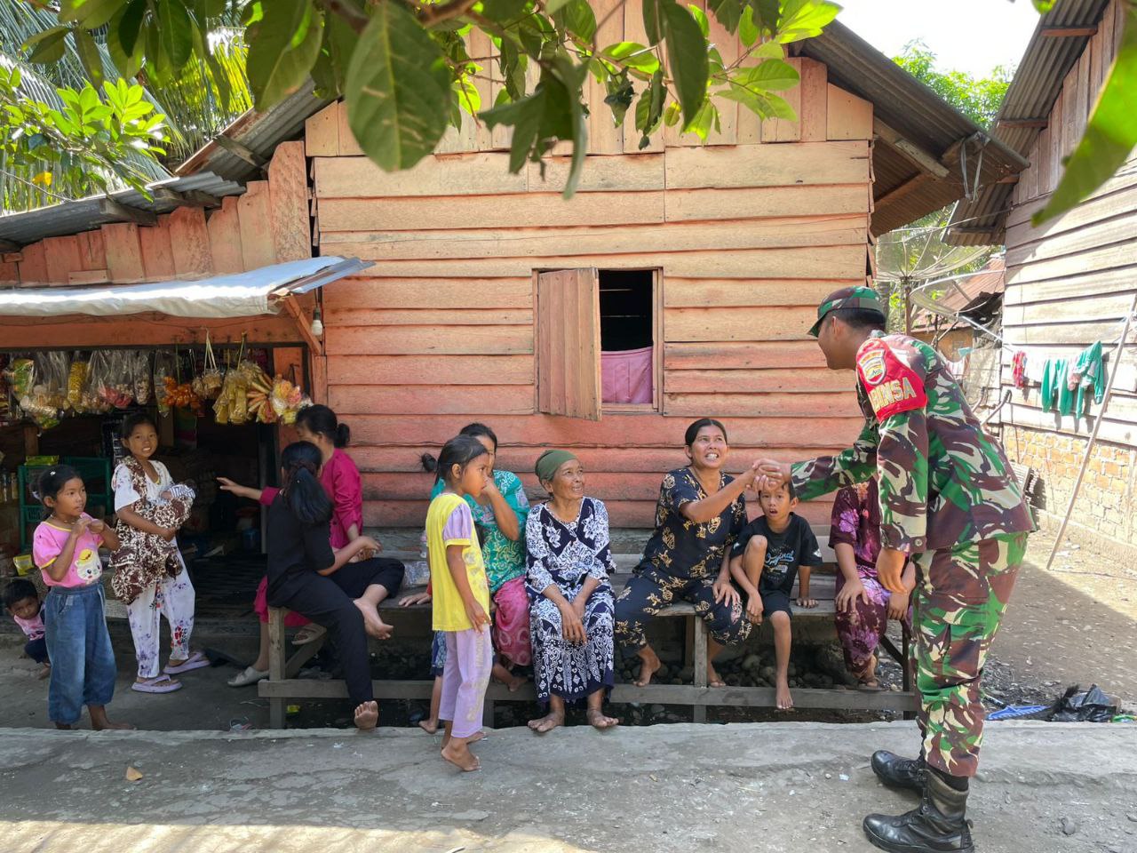 Dalam kegiatannya, Babinsa menyinggahi salah satu rumah warga sekaligus melaksakan komsos menjalin dan membina silaturahmi serta pendekatan bersama ibu-ibu dan anak-anak di wilayah desa binaan