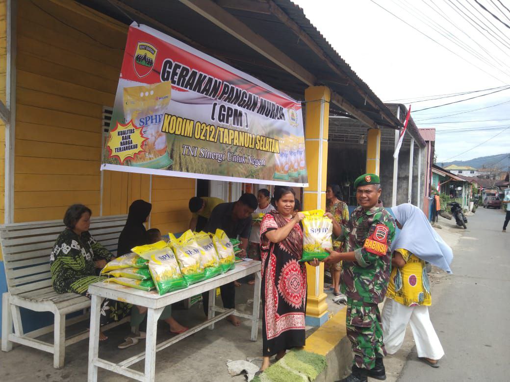 Padangsidimpuan – Koramil 02/Kota Padangsidimpuan Kodim 0212/Tapsel mengerahkan personel Babinsa untuk mensukseskan program pemerintah dengan menggelar Gerakan Pangan Murah (GPM) dalam rangka stabilisasi pasokan dan harga pangan (SPHP) serta pengendalian inflasi daerah. Kegiatan ini digelar oleh Babinsa di wilayah desa dan kelurahan masing-masing di wilayah Kota Padangsidimpuan, Minggu (24/08/2025)