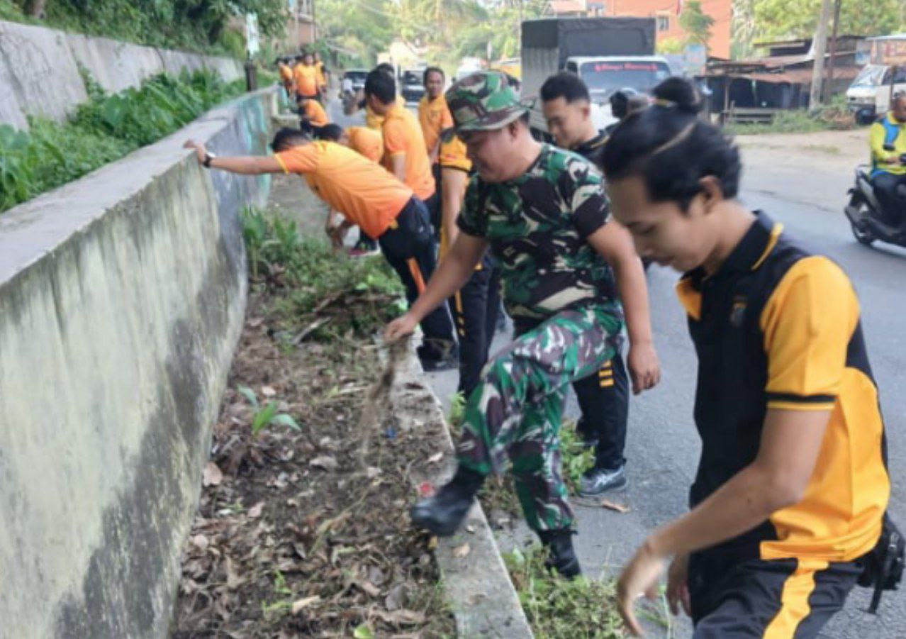 Padangsidimpuan - Babinsa Koramil 02/Kota Padangsidimpuan Kodim 0212/Tapsel dipimpin Serka Suleman bersama warga gotong royong membersihkan lingkungan di sekitar Jalan Sisingamangaraja Kelurahan Sitamiang Kecamatan Padangsidimpuan Selatan Kota Padangsidimpuan, Jumat (14/11/2025)