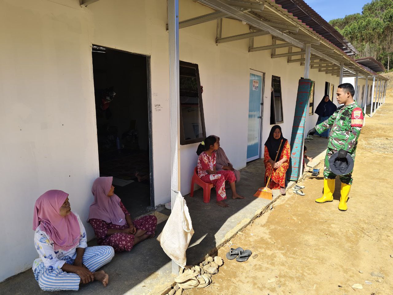 Dalam kegiatannya, Babinsa Serda Henri Sormin menyapa dan berbincang dengan beberapa warga khususnya Ibu-ibu yang berada di lokasi rumah Huntara