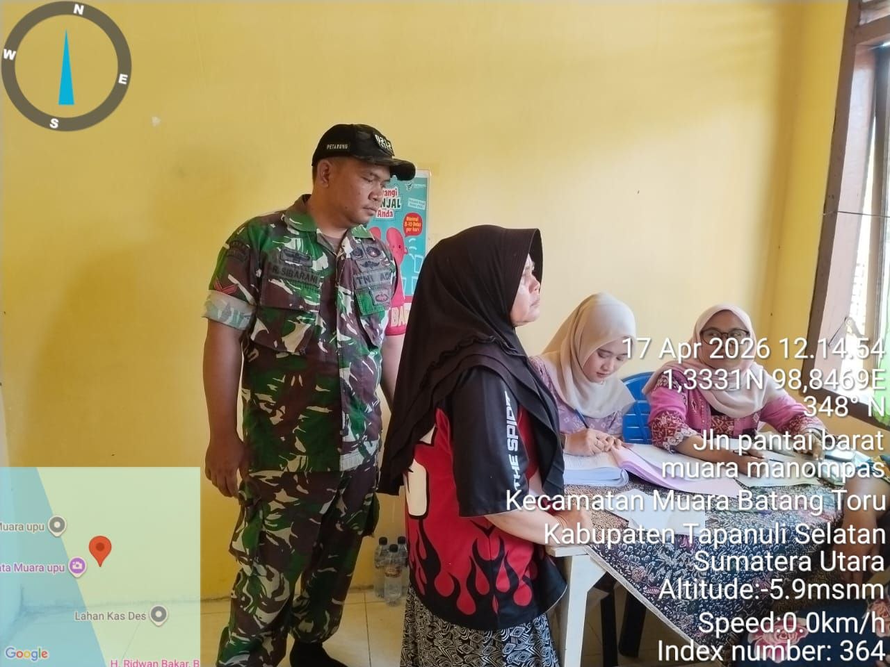 Muara Batang Toru - Babinsa Koramil 01/Batang Toru Kodim 0212/Tapsel Kopda Rolan SIbarani melaksanakan kegiatan monitoring pengobatan dan pengecekan kesehatan gratis oleh tenaga kesehatan Puskesmas Muara Batang Toru bertempat di Kantor Desa Muara Upu Kecamatan Muara Batang Toru Kabupaten Tapanuli Selatan, Jumat (17/04/2026)